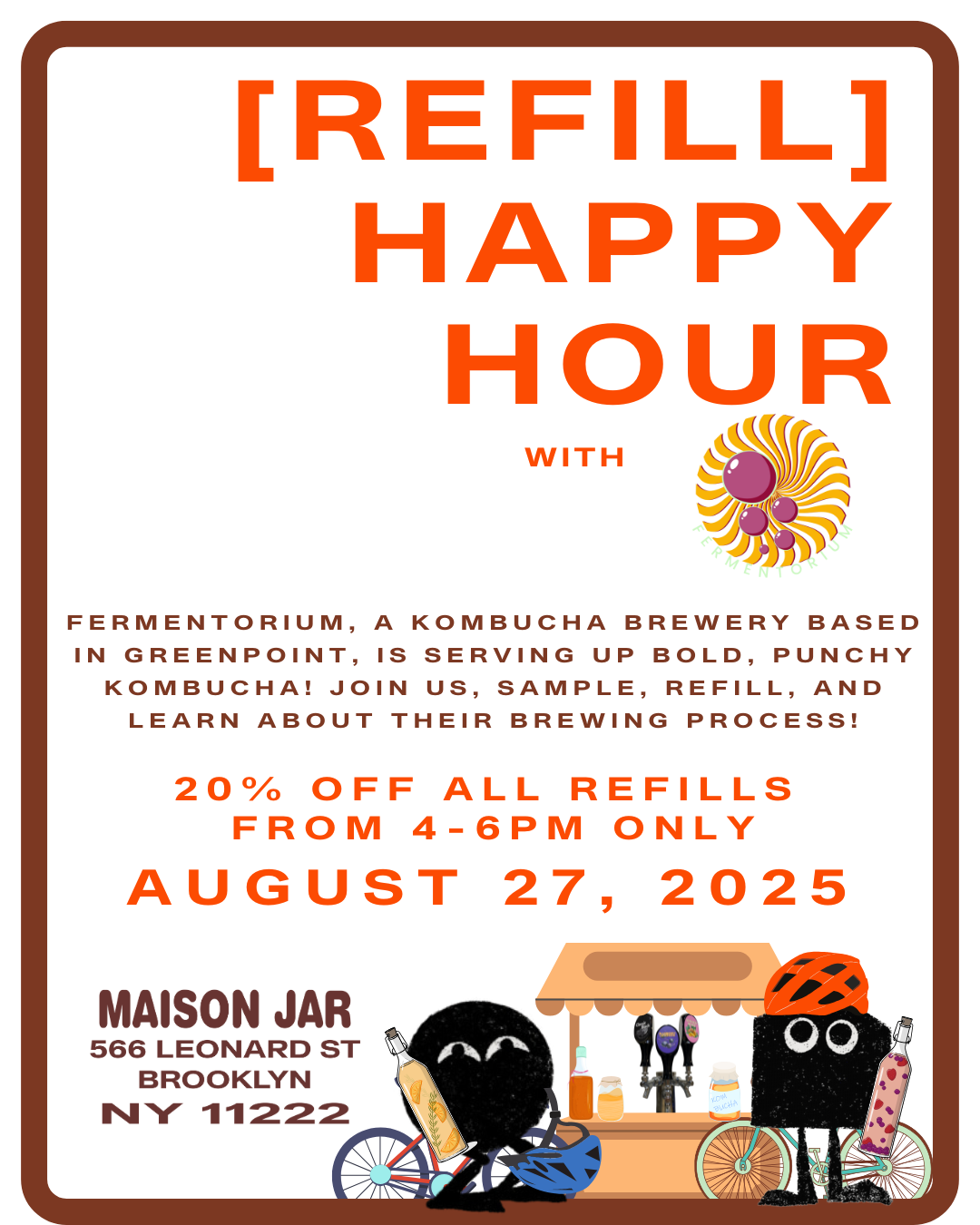 It’s not summer without some cold and refreshing kombucha! We’re excited to be joined by @fermentoriumnyc for this month’s refill happy hour 🥳 Come try some samples on 8/27 and receive 20% off your refills from 4-6pm! 🧡