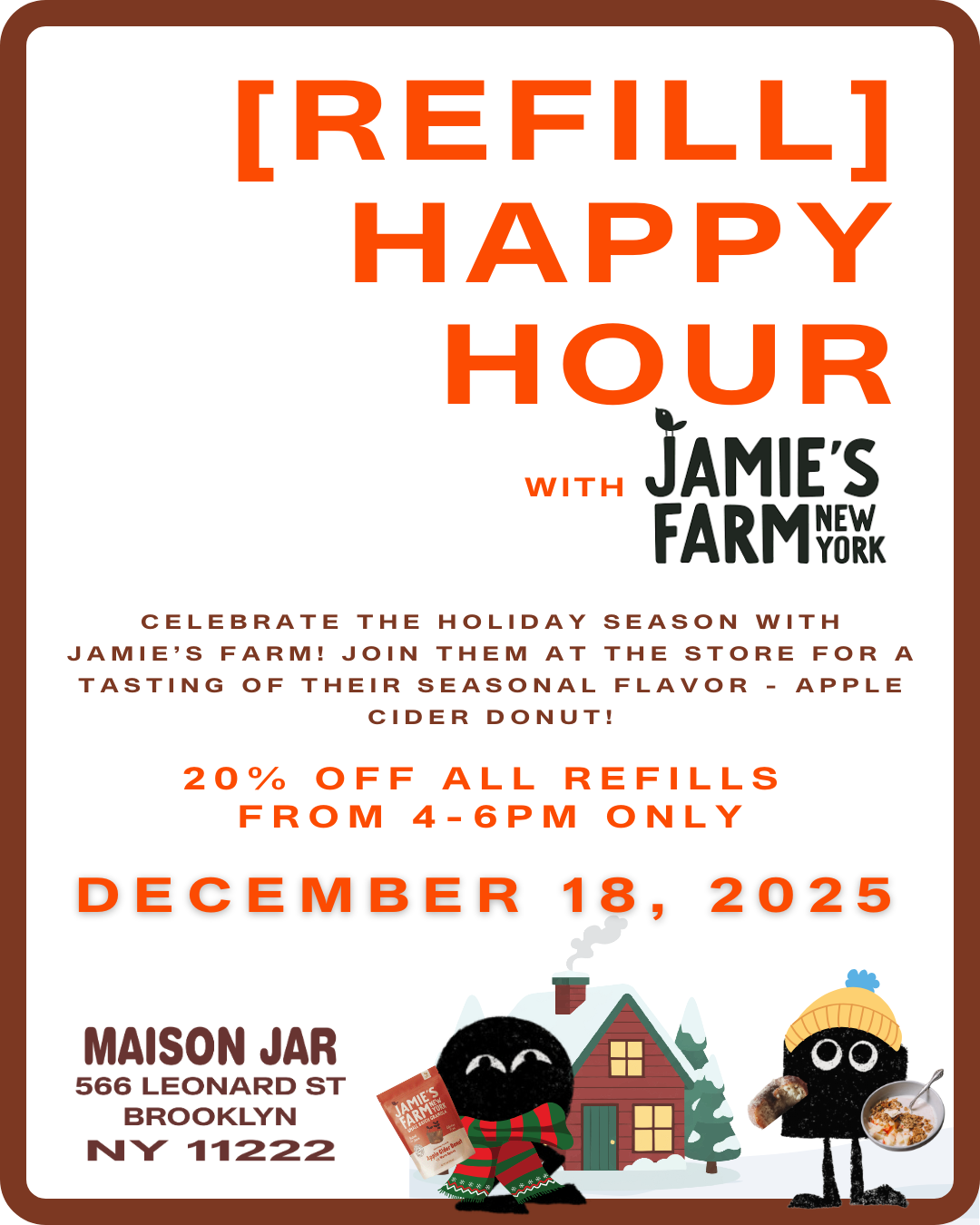 Missed our holiday market this weekend? We’ve got another exciting evening ahead with @jamiesfarmnewyork on 12/18 from 4-6 for this month’s refill happy hour! 🧡 Get 20% off refills and stock up on all of your favorites or pick up low-waste gifts and stocking stuffers along the way 🥰🎁 A reminder that we close early at 5pm on 12/24 and closed all day 12/25!