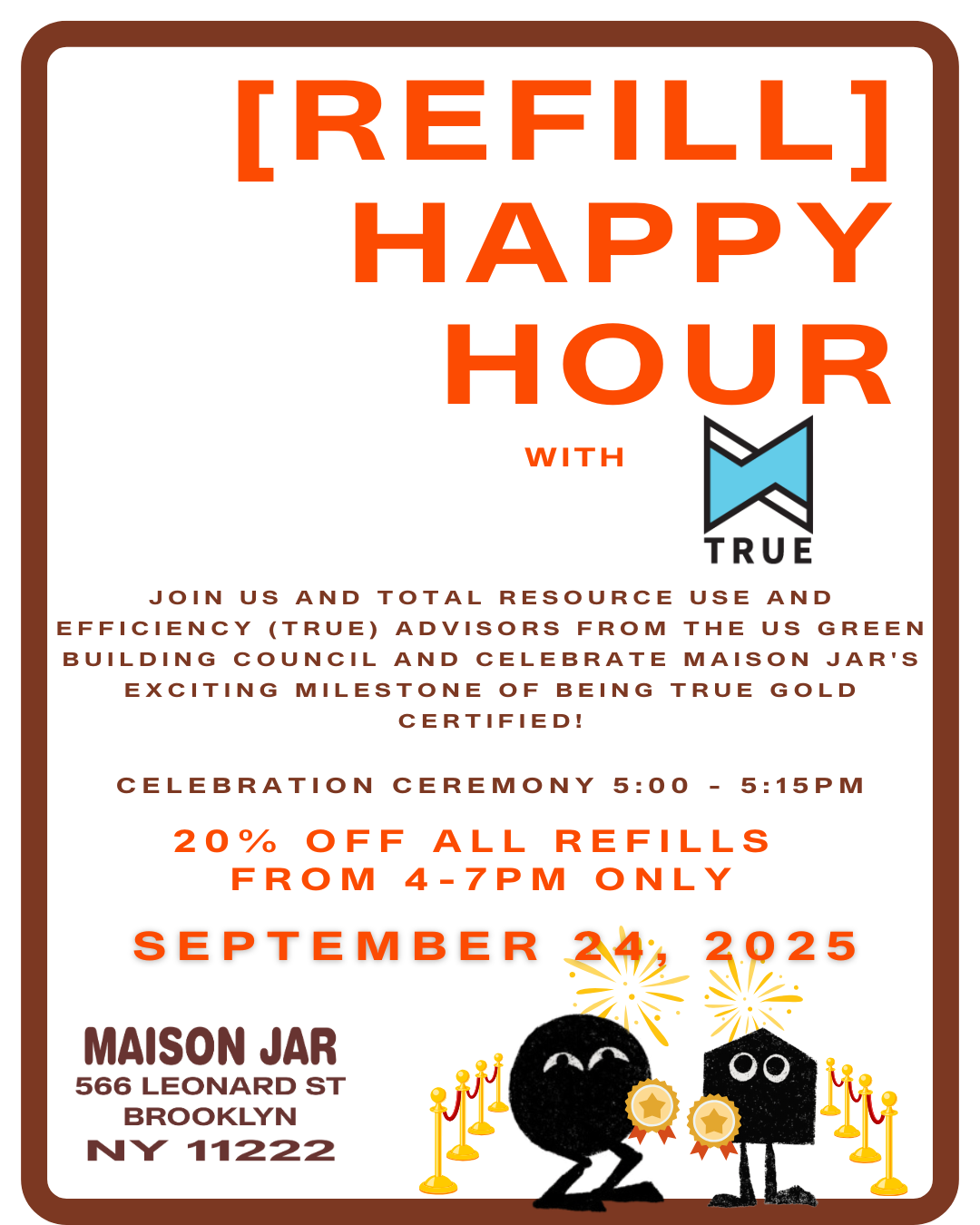 REGISTERJoin us for this month’s Refill Happy Hour with the TRUE Advisors from the U.S. Green Building Council as we celebrate an exciting milestone 🥳 Over a year in the making, we’re finally excited to share that Maison Jar is now TRUE Gold Certified! 🏅🌍