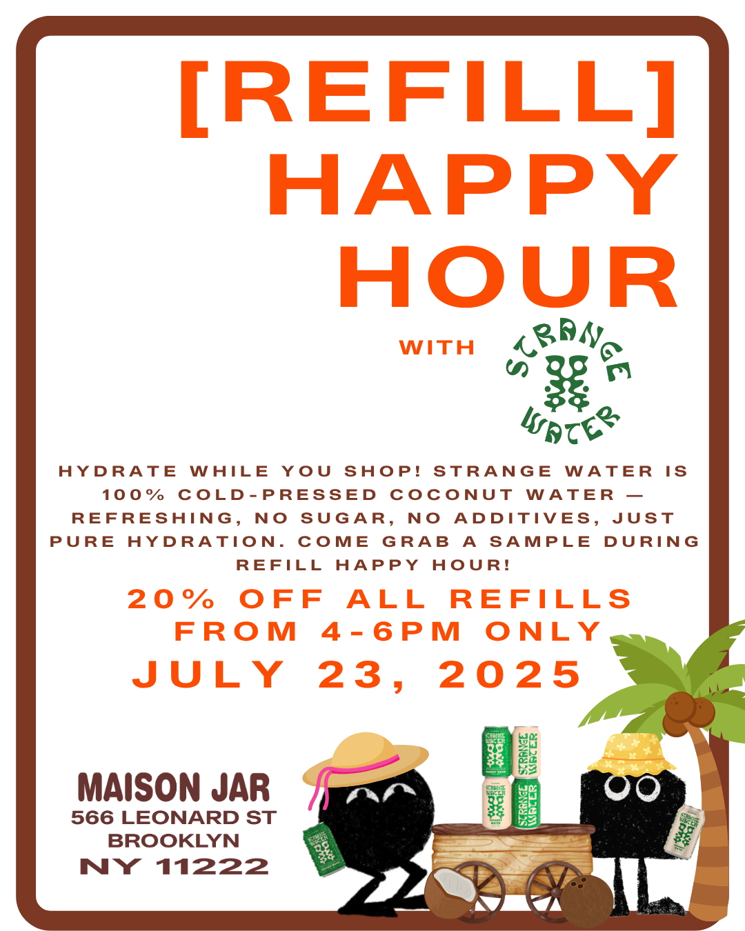 REGISTERSay hello to @drinkstrangewater next Wednesday, 7/23 for this month’s refill happy hour! Stop by for a sip and stay refreshed while enjoying 20% off all refills from 4-6pm 🥥☀️🌴