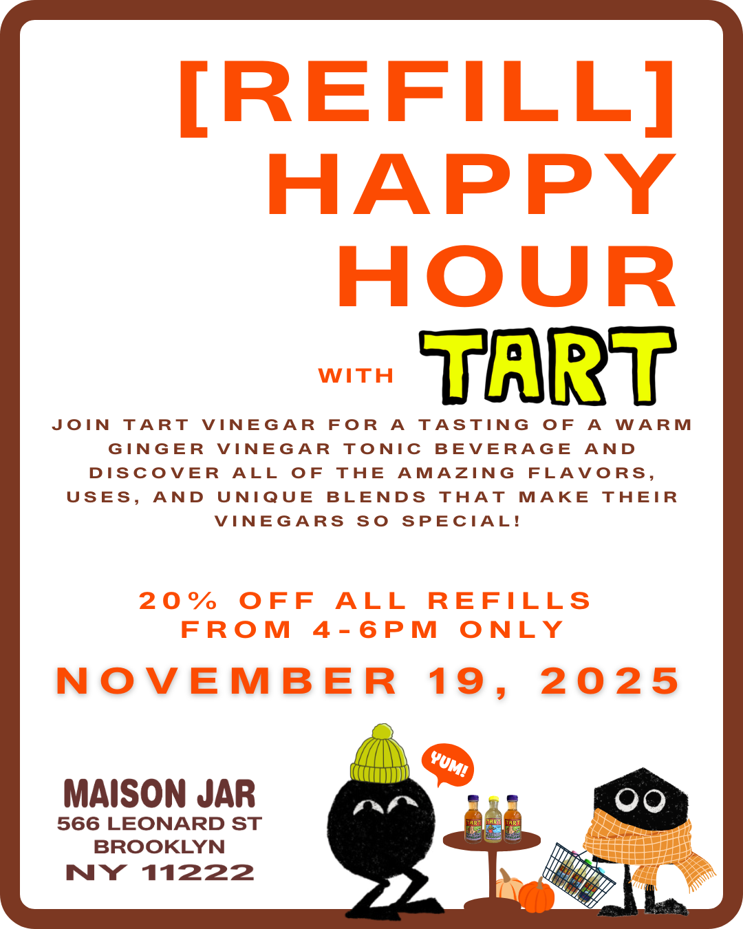REGISTERWe’re so excited to now carry @tartvinegar at Maison Jar! 🥳👏✨ Come taste it for yourself at our next Refill Happy Hour on 11/19 from 4-6pm. Sample their amazing vinegars, learn more about the flavors, and see why we’re so thrilled to have them in the store! 🧡