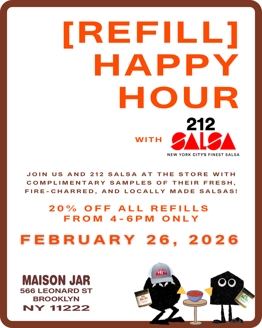 Our next monthly refill happy hour is this Thursday from 4pm-6pm with @212salsanyc ! ✨🍅 We are so excited for everyone to try the delicious salsas handmade locally in NYC and meet Jon, the 🧠 behind it all! 🧡🤩